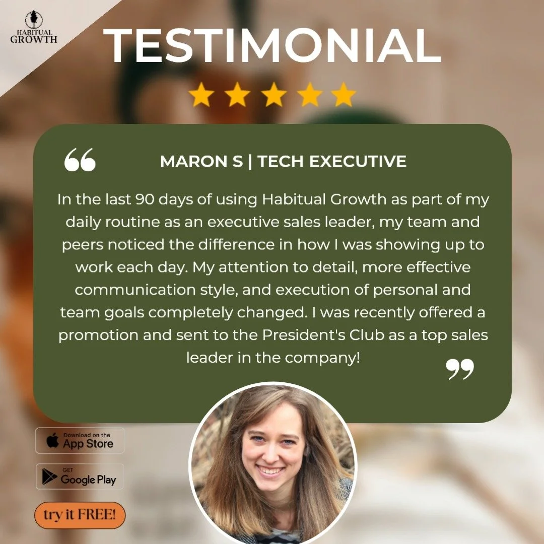โIn the last 90 days of using Habitual Growth as part of my daily routine as an executive sales leader, my team and peers noticed the difference in how I was showing up to work each day. My attention to detail, more effective communication style, and execution of personal and team goals completely changed. I was recently offered a promotion and sent to the President's Club as a top sales leader in the company!โ